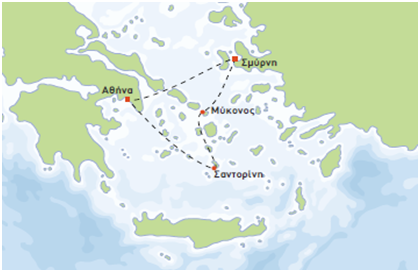 Δρομολόγιο: Πειραιάς, Σαντορίνη,Μύκονος, Σμύρνη (Τσεσμέ), Πειραιάς